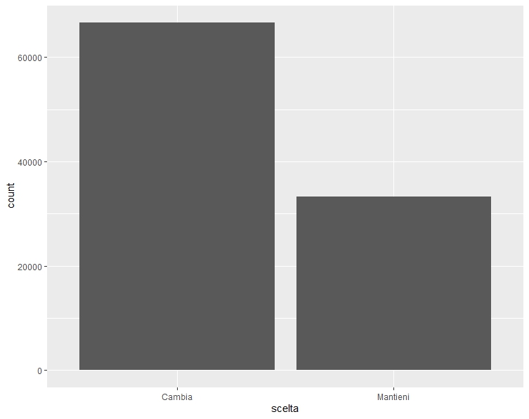 Invece il calcolo delle probabilità ci dice che cambiare è statisticamente la scelta migliore (p = 2/3) rispetto a non cambiare (p =1/3). Potete provarlo empiricamente anche con tre carte (ad esempio con l’asso di denari vincente) e giocare un tot numero di mani segnando quante volte cambiare si rileva vincente. Io l’ho fatto con un semplice algoritmo in R: giocando 100.000 mani la probabilità di vincere cambiando si attesta al 66,7%.