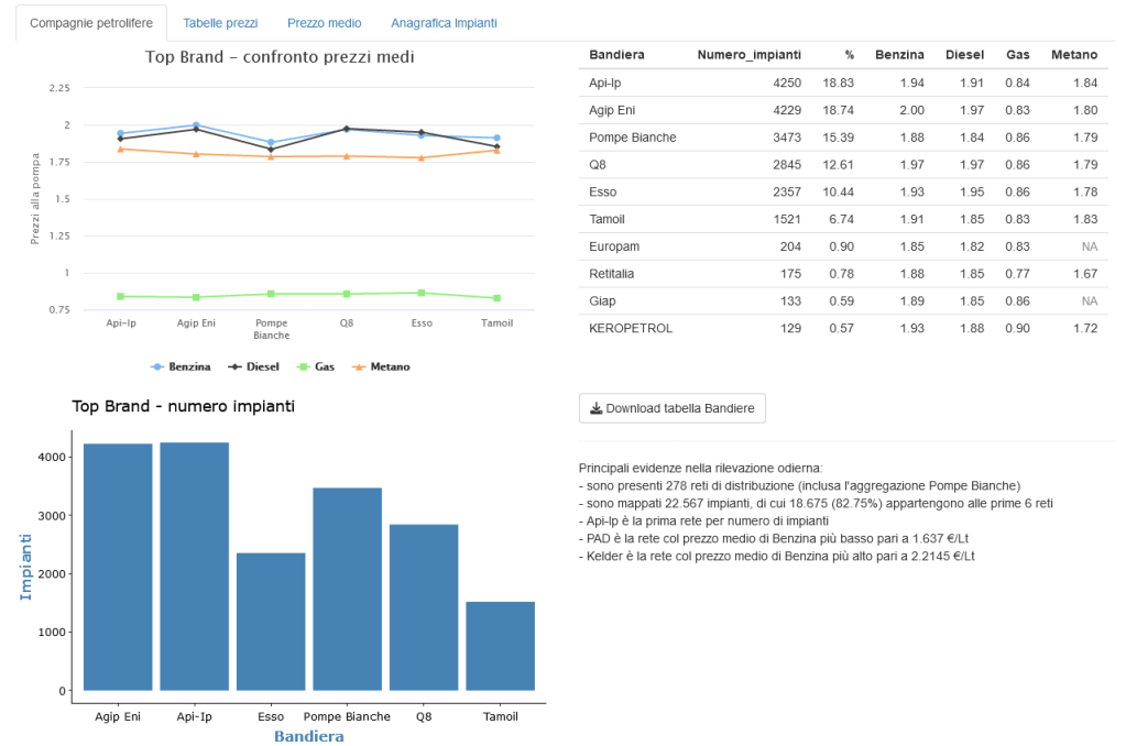 Una volta caricati, i dati vengono elaborati automaticamente seguendo gli stessi passaggi logici che si farebbero dovendo effettuare le analisi manualmente su excel. Ad esempio, in questa prima tab viene aggiornata e visualizzata la tabella relativa alle “Bandiere” ovvero le compagnie petrolifiche e le reti di distribuzione e i relativi grafici con il confronto dei prezzi e il numero di impianti presenti.