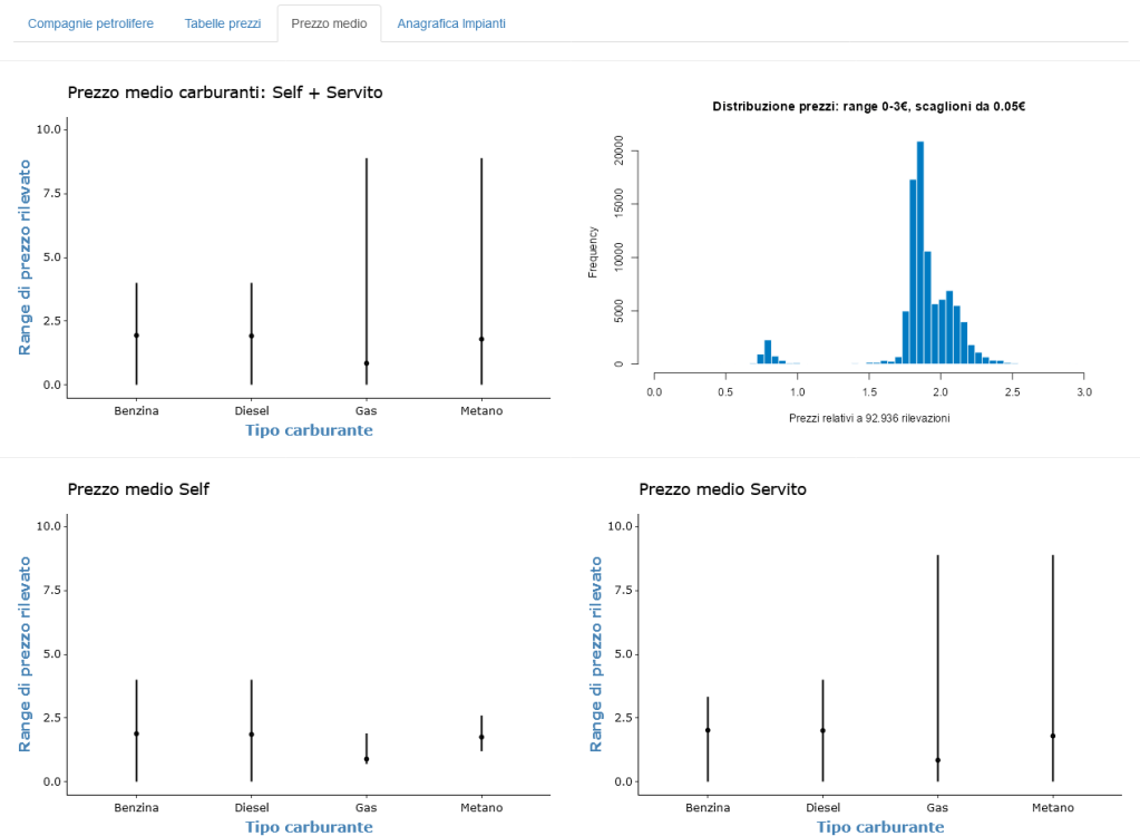 Nella terza tab invece vengono generati i grafici interattivi con la distribuzione dei prezzi di tutte le rilevazioni ed i prezzi medi per tipo carburante.