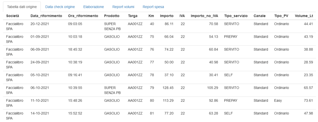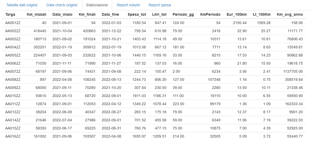 In questo esempio con dati fittizzi, viene creata una tabella riepilogativa per ciascuna targa con tutte le informazioni utili per il controllo di consumi e spesa.