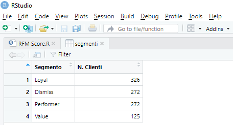 Di R ho già parlato altre volte, e lo considero uno strumento primario per fare data analysis. In particolare, nell’esempio qui sotto, ho utilizzato lo specifico pacchetto rfm di R, per eseguire la segmentazione, identificando e classificando i clienti sulla base delle regole stabilite.